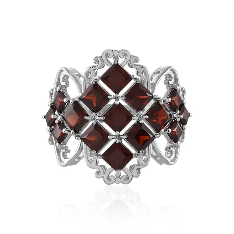 Entdecken Sie die Faszination dieses prächtigen Granat-Silberrings aus Mosambik. Mit insgesamt 4,67 Karat funkeln seine 15 Granate im Prinzess-Schliff in einem harmonischen quadratischen Muster und versprühen einen königlichen Charme. Das 925er Sterlingsilber, verziert mit einem kunstvollen Rankenwerk und einer Platinplattierung, bringt die tiefroten Farbtöne für einen wahrhaft opulenten Effekt zur Geltung. Perfekt für den Abend oder als auffällige Ergänzung zu einem raffinierten Outfit, ist dieser Ring ein Statement-Stück, das die Essenz der Eleganz einfängt.