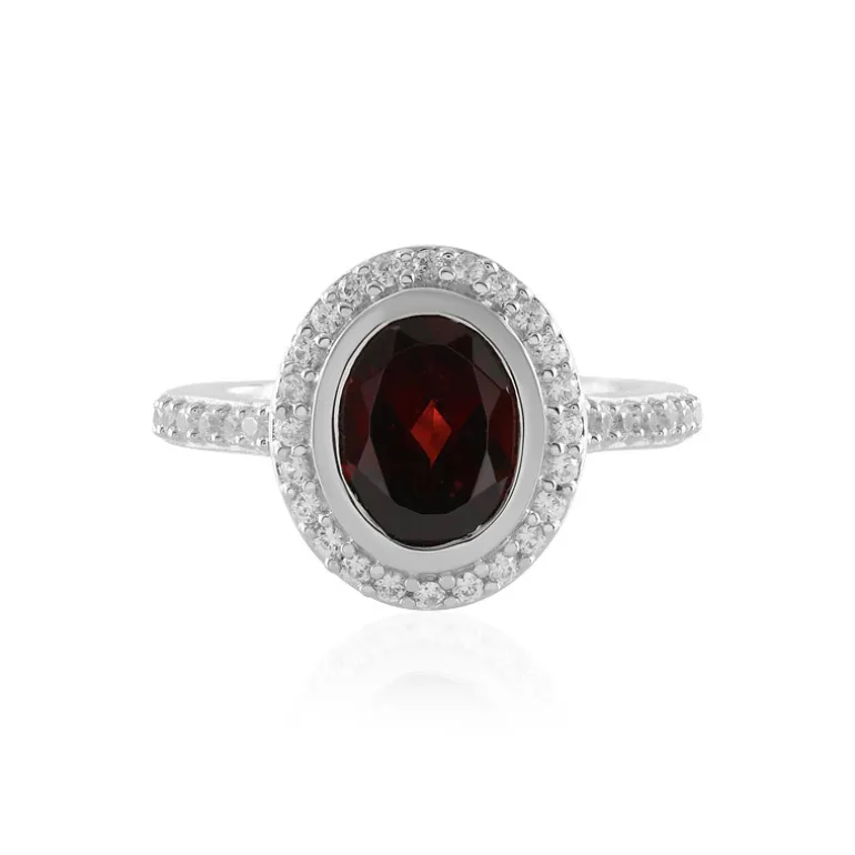 Wir präsentieren einen atemberaubenden Granatring aus Mosambik, gefasst in glattem platiniertem 925er Sterlingsilber. Der tiefrote Granat im Ovalschliff mit einem Gewicht von 1,85 Karat wird elegant von funkelnden Zirkonen aus Kambodscha eingerahmt. Das Gesamtkaratgewicht beträgt 2,374 ct. Dieser Ring ist perfekt geeignet, um Abendgarderobe oder besonderen Anlässen einen Hauch von Raffinesse zu verleihen. Er bietet eine Mischung aus exotischem Reiz und zeitloser Schönheit.