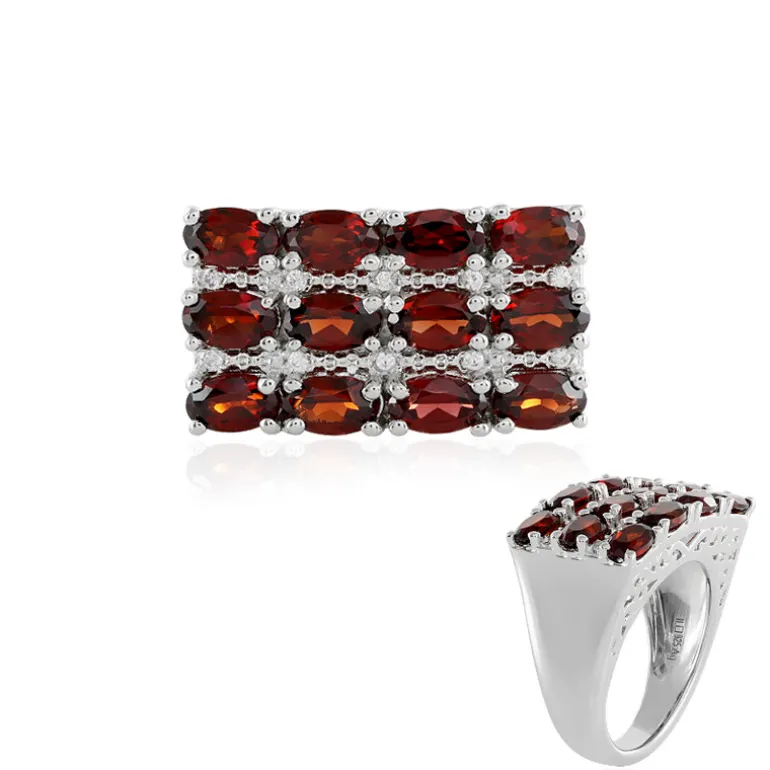 Dieser verführerische Ring besteht aus 12 ovalen Mosambik-Granaten von insgesamt 3,25 Karat, die in einem nahtlosen Muster gefasst sind, das ihren tiefroten Farbton zur Geltung bringt. Ergänzt durch funkelnde Zirkon-Akzente im Rundschliff aus Tansania, strahlt jedes Stück in einem warmen, feurigen Glanz. Die fachmännische Verarbeitung ist in 925er Sterlingsilber mit einer luxuriösen Platinbeschichtung eingefasst und wiegt etwa 5,6 Gramm. Dieser Ring eignet sich perfekt, um sowohl tagsüber als auch abends einen Hauch von Eleganz zu verleihen und ist ein Statement für Raffinesse und zeitlosen Stil.