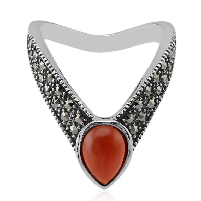 Entdecken Sie eine Mischung aus Eleganz und Raffinesse mit diesem Mosambik-Granatring aus Sterlingsilber. Mit einem 1,37-karätigen birnenförmigen Cabochon-Granat und schimmernden österreichischen Markasit-Akzenten ist dieses Schmuckstück sowohl für legere als auch für formelle Anlässe geeignet. Kombinieren Sie ihn mit einem eleganten Abendkleid für einen zeitlosen Look oder setzen Sie einen Farbtupfer in Ihrer Alltagskleidung.