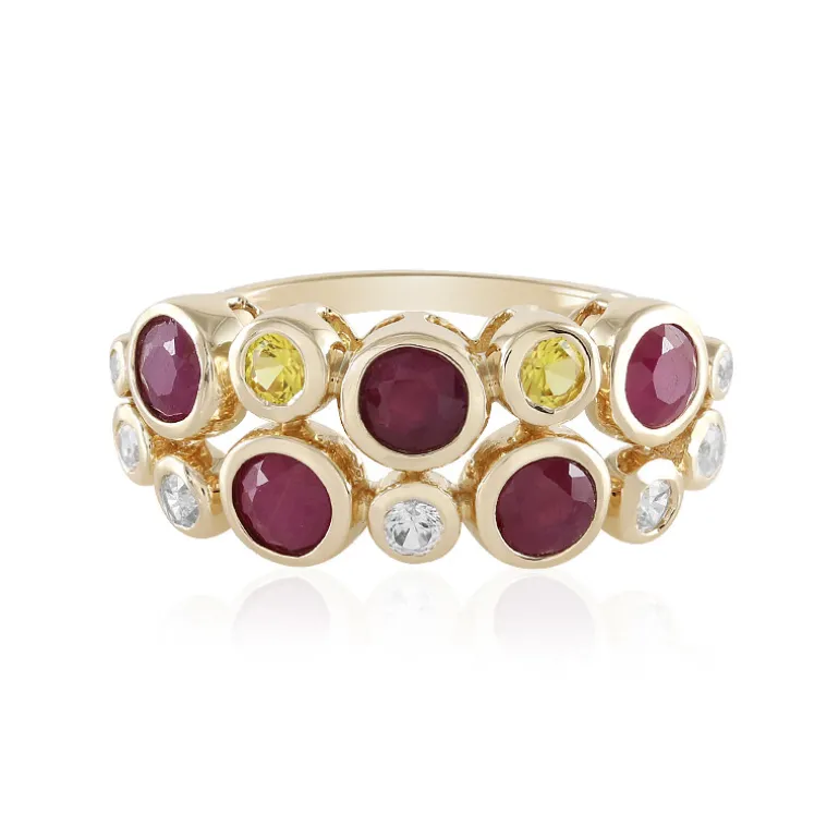 Genießen Sie den lebhaften Kontrast zwischen Rubinen aus Mosambik und gelben Saphiren aus Ceylon mit diesem schicken Ring aus 375 Gold. Mit 1,902 ct glänzenden Rubinen und 0,249 ct funkelnden Saphiren ist dieses Schmuckstück ein Zeugnis der Eleganz. Kambodschanische Zirkone mit einem Gesamtgewicht von 0,435 ct sorgen für zusätzliches Funkeln in einem raffinierten Design von 23 x 23 mm. Dieser Ring eignet sich perfekt für besondere Abende oder um Ihrer Alltagskleidung einen Hauch von Farbe zu verleihen. Er zieht mit Sicherheit Bewunderung auf sich und wertet jedes Ensemble auf.