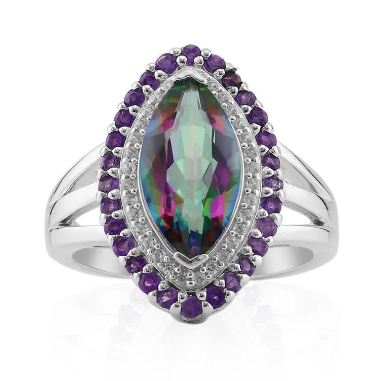 Entdecken Sie die faszinierenden Farbtöne unseres Rings aus Mystic Quartz und Amethyst. Dieses aus 925er Sterlingsilber gefertigte Schmuckstück präsentiert einen atemberaubenden Mystic Quartz im Marquise-Schliff von 2,865 Karat aus Brasilien in einer königlichen Fassung. Er wird von einer beeindruckenden Konstellation aus 28 sambischen Amethysten im Rundschliff von insgesamt 0,386 Karat eingerahmt und mit 32 glitzernden tansanischen Zirkonen von 0,202 Karat akzentuiert. Das Gesamtkaratgewicht von 3,453 Karat ist harmonisch in das Design eingearbeitet und macht ihn zu einer prächtigen Ergänzung für jede Sammlung. Dieses farbenfrohe Schmuckstück ist perfekt für den Abend oder als Farbakzent für den Alltag geeignet und zieht alle Blicke auf sich.