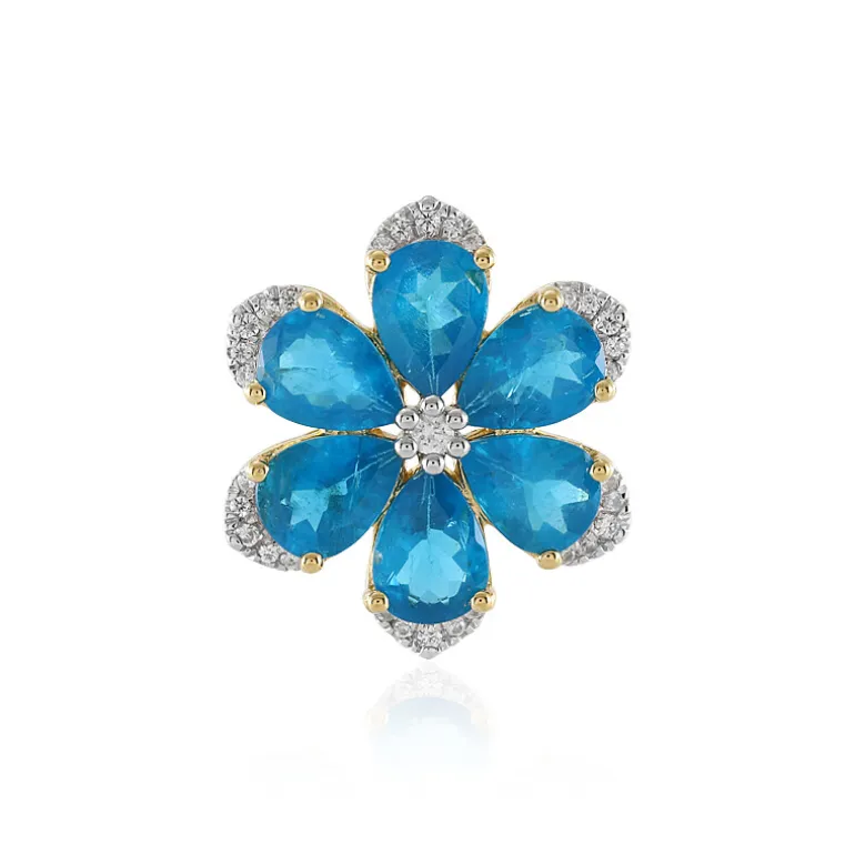 Entdecken Sie den strahlenden Charme dieses atemberaubenden Anhängers mit sechs exquisiten neonblauen Apatit-Edelsteinen aus Brasilien. Jeder Edelstein ist meisterhaft in Tropfenform geschliffen und hat insgesamt 3,583 Karat. Er ist in 925er Sterlingsilber mit einer eleganten Goldplattierung gefasst. Kambodschanische Zirkon-Akzente verleihen dieser 1,59 g schweren, von Blumen inspirierten Kreation zusätzlichen Glanz. Dieses Schmuckstück ist ideal, um jedem Ensemble einen Hauch von Farbe zu verleihen, und eignet sich sowohl für lässige Brunchs als auch für anspruchsvolle Abendveranstaltungen.