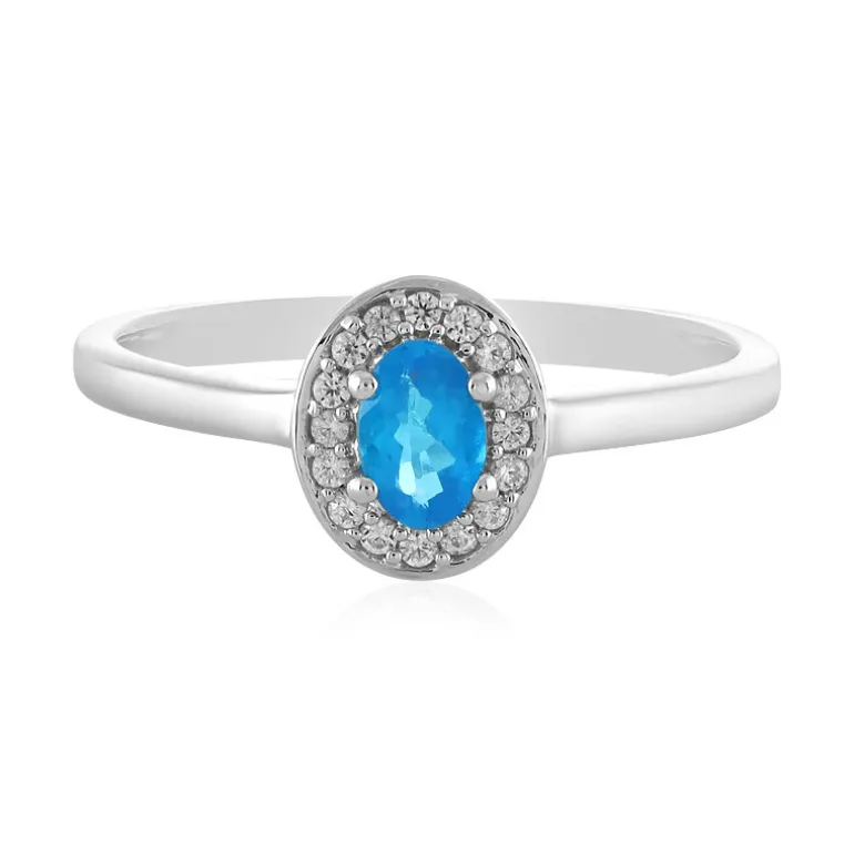 Lassen Sie sich von der Anziehungskraft des neonblauen Apatits verzaubern mit diesem faszinierenden Ring, einem Schatz von den pulsierenden Küsten Brasiliens. Eingebettet in einen Heiligenschein aus funkelnden kambodschanischen Zirkonen von insgesamt 0,19 Karat, erstrahlt der ovale Mittelteil in einem satten, elektrisierenden Farbton. Das Schmuckstück ist aus hochwertigem 925er Sterlingsilber mit einer luxuriösen Platinbeschichtung gefertigt und wiegt ca. 2,76 g. Durch sein modernes Design passt es perfekt zu trendiger Kleidung oder verleiht einem klassischen Look einen Hauch von Farbe, ideal sowohl für einen legeren Brunch als auch für eine Abendgala.