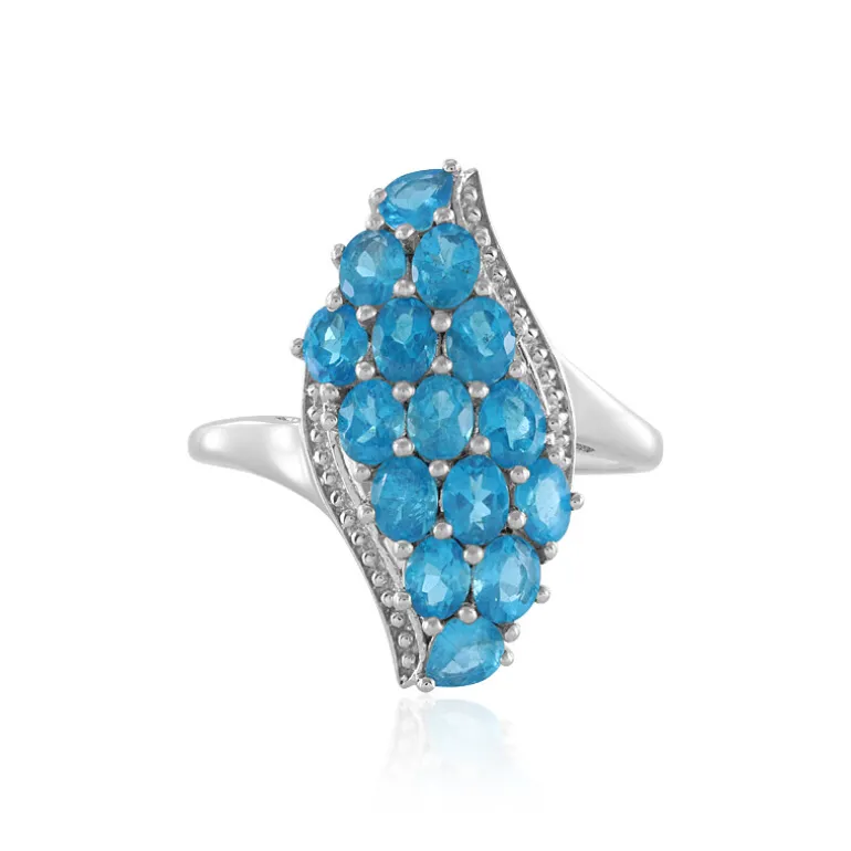 Dieser exquisite Ring präsentiert eine atemberaubende Reihe von 15 neonblauen Apatit-Edelsteinen von insgesamt 2,226 Karat, gefasst in poliertem 925er platiniertem Sterlingsilber. Die Edelsteine schimmern in einem tropischen Ozean-Farbton und wurden sorgfältig in ovalen und tropfenförmigen Formen geschliffen, um maximale Brillanz zu erzielen. Das zeitgenössische Design misst 24×20 mm und setzt ein kühnes Statement. Er passt sowohl zu legeren als auch zu eleganten Outfits und ist eine vielseitige Ergänzung für jede Kollektion. Peppen Sie Ihr Ensemble mit diesem strahlenden Schmuckstück auf, das das Licht und bewundernde Blicke auf sich ziehen wird.