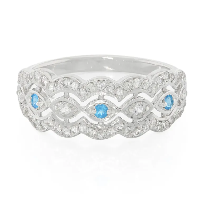 Dieser filigrane Silberring präsentiert ein Trio von atemberaubenden neonblauen Apatit-Edelsteinen aus der üppigen Landschaft Brasiliens, gemischt mit einer Reihe von funkelnden weißen Saphiren aus Madagaskar. Die Edelsteine sitzen elegant auf einem Hintergrund aus 925er Sterlingsilber und haben insgesamt etwa 0,559 Karat. Er symbolisiert eine Mischung aus moderner Eleganz und zeitloser Raffinesse und ist ein echter Hingucker. Perfekt, um Ihre tägliche Kleidung zu akzentuieren oder ein Ensemble für besondere Anlässe zu vervollständigen.