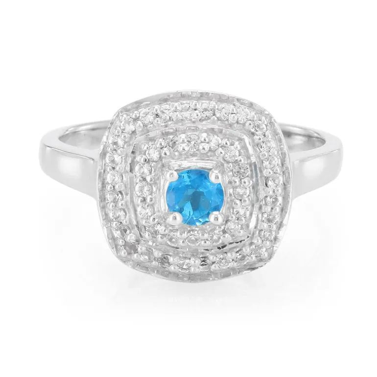 Dieser atemberaubende Ring zeigt einen faszinierenden neonblauen Apatit, der aus den üppigen Landschaften Brasiliens stammt, umgeben von einer Reihe funkelnder weißer Topase. Mit einem Gesamtkaratgewicht von 0,402 ct ist der zentrale Apatit meisterhaft auf eine runde Form von 3,6 mm geschliffen, die seine lebhaften Farben zur Geltung bringt. Das Band aus 925er Sterlingsilber verleiht diesem exquisiten Stück zeitlose Eleganz. Dieser Ring eignet sich perfekt, um einen Hauch von Farbe in einen schicken Tageslook zu bringen oder ein raffiniertes Abendensemble zu ergänzen und wird Sie auf Schritt und Tritt in seinen Bann ziehen.