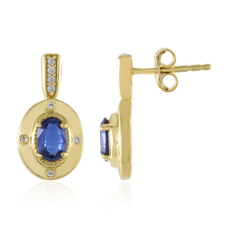 Entdecken Sie die Faszination dieser atemberaubenden Ohrringe mit nepalesischem Kyanit und kambodschanischen Zirkon-Akzenten. Die Fassung aus vergoldetem 925er Sterlingsilber bietet eine luxuriöse Kulisse, die das tiefe Blau des Kyanits hervorhebt. Diese Ohrringe eignen sich perfekt für elegante Abende oder um Ihrem Alltagsstil einen Hauch von Raffinesse zu verleihen und sind eine vielseitige Ergänzung für jede Schmucksammlung.