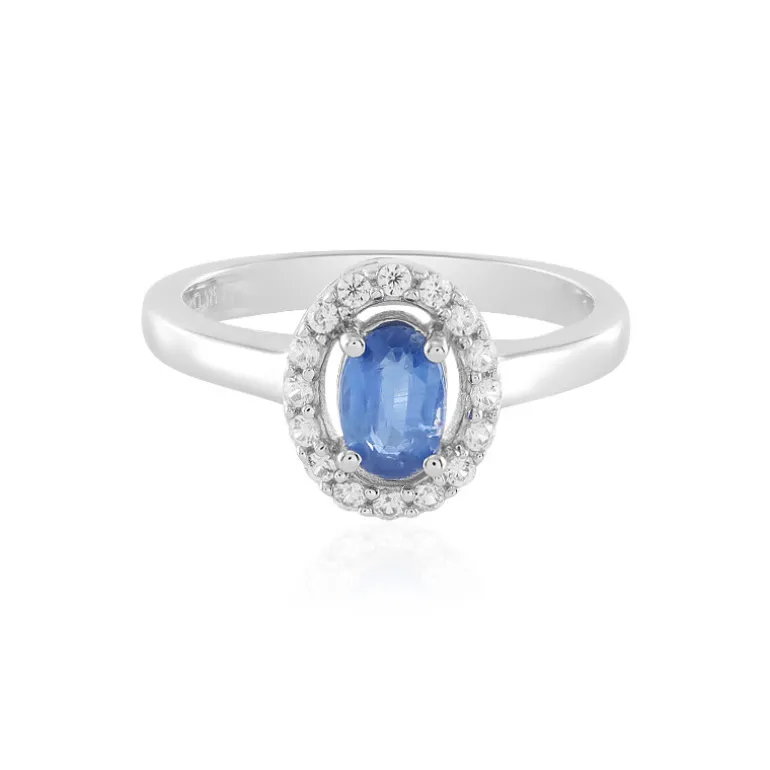Entdecken Sie die Anziehungskraft dieses faszinierenden Rings aus nepalesischem Kyanit mit einem lebhaften Mittelstein von 0,516 ct im klassischen Ovalschliff, der sanft von einem Halo aus glitzernden Zirkonen aus Kambodscha von insgesamt 0,106 ct umgeben ist. Dieser Ring aus hochglanzpoliertem 925er Sterlingsilber mit Platinüberzug für zusätzlichen Glanz ist ein Schatz, der traditionelle Eleganz mit modernem Reiz verbindet. Perfekt als schicke Ergänzung zu Ihrer Alltagskleidung oder als auffälliges Stück für besondere Anlässe.