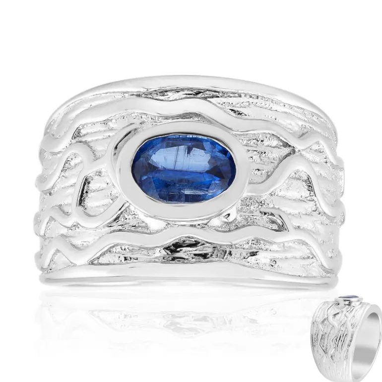 Entdecken Sie die raffinierte Anziehungskraft des nepalesischen Kyanit-Sterlingsilberrings aus der Monosono Kollektion. Dieser Ring mit einem auffälligen Kyanit von 0,967 Karat im Ovalschliff ist in platiniertem 925er Sterlingsilber gefasst und bietet ein einzigartiges Design mit strukturierten Details. Er eignet sich sowohl für legere als auch für formelle Anlässe. Kombinieren Sie ihn mit einem frischen weißen Hemd oder einem marineblauen Kleid, um seinen leuchtend blauen Farbton zu unterstreichen und jedem Ensemble einen eleganten Touch zu verleihen.