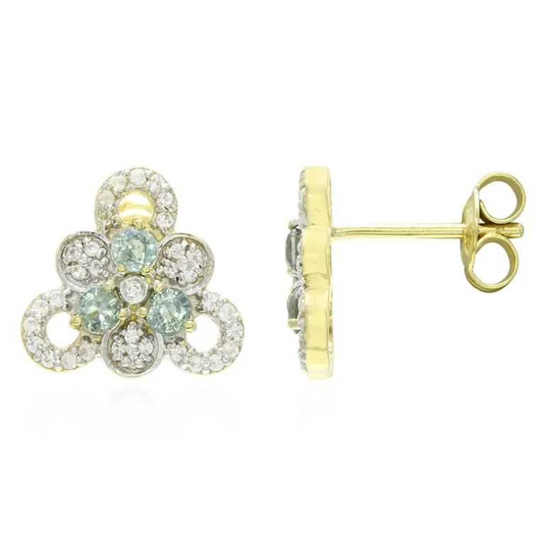 Entdecken Sie die Faszination dieser Ohrringe aus grünem, nicht erhitztem Saphir. Sie sind aus vergoldetem 925er Sterlingsilber gefertigt und bestehen aus sechs tansanischen Saphiren, die von kambodschanischen Zirkonen hervorgehoben werden. Sie eignen sich perfekt, um jedem Outfit Eleganz zu verleihen und sind ideal für Verabredungen zum Essen oder besondere Anlässe. Das strahlende Blumendesign zieht die Blicke auf sich und verleiht Ihrer Accessoire-Kollektion sowohl Charme als auch Raffinesse.