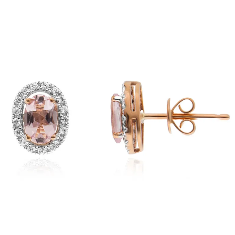 Diese atemberaubenden Ohrringe zeigen den zarten Farbton von nicht erhitzten rosafarbenen Beryllsteinen aus Brasilien, die in einem eleganten ovalen Schliff gefasst sind. Die 0,652 Karat schweren rosafarbenen Edelsteine werden von funkelnden Zirkonen von insgesamt 0,22 Karat umrahmt, die ihnen einen Hauch von Brillanz verleihen. Diese Ohrringe aus 9 Karat Roségold mit einem Gesamtgewicht von ca. 1,08 g strahlen Wärme und Raffinesse aus. Sie sind eine fabelhafte Wahl, um sowohl der Tages- als auch der Abendgarderobe einen Hauch von Farbe und Eleganz zu verleihen und sind eine vielseitige Ergänzung für jede Schmucksammlung.