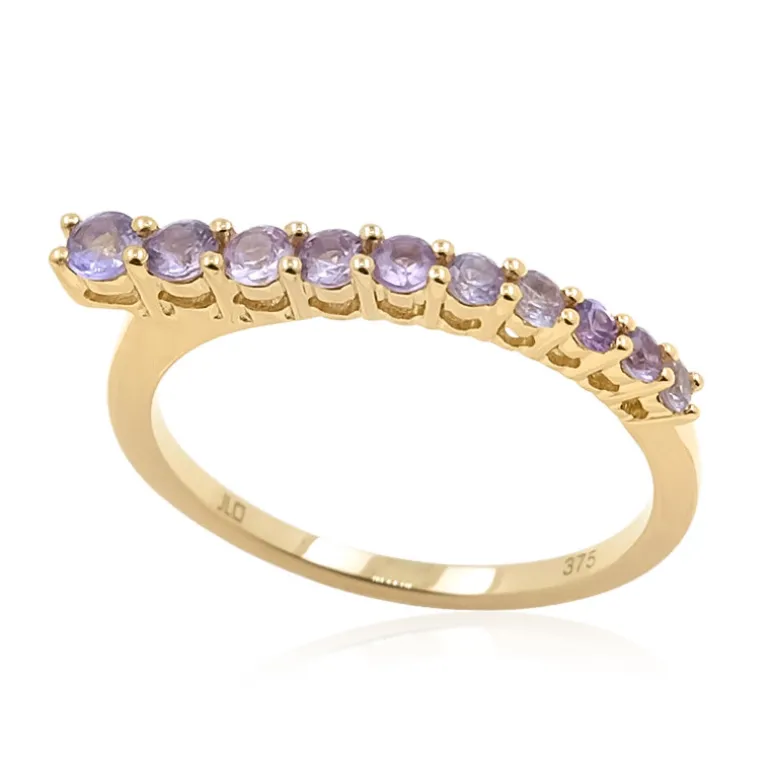 Entdecken Sie die subtile Eleganz dieses Rings aus 9-karätigem Gelbgold, der mit einem Farbverlauf aus unerhitzten violetten Ceylon-Saphiren aus Sri Lanka von insgesamt 0,451 Karat verziert ist. Die Abstufung der Saphire von 2,5 mm bis 2,1 mm Größe verleiht diesem exquisiten Schmuckstück eine faszinierende Note. Dieser Ring eignet sich perfekt, um sowohl legere als auch formelle Looks mit einem Hauch von königlicher Farbe zu bereichern, und verspricht, eine wertvolle Ergänzung für jede Schmucksammlung zu sein.