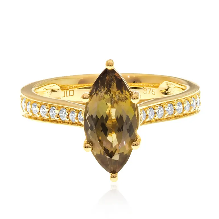 Zeigen Sie zeitlose Eleganz mit diesem Ring aus 9 Karat Gelbgold, der einen atemberaubenden tansanischen Tansanit im Marquiseschliff von 2,03 Karat enthält. Der zentrale Edelstein wird von funkelnden Diamanten der Güteklasse G mit einem Gesamtgewicht von 0,40 Karat flankiert und strahlt luxuriösen Charme aus. Dieser Ring ist die ideale Wahl für besondere Anlässe, er harmoniert wunderbar mit Abendkleidern oder verleiht Ihrer Alltagskleidung einen raffinierten Touch.