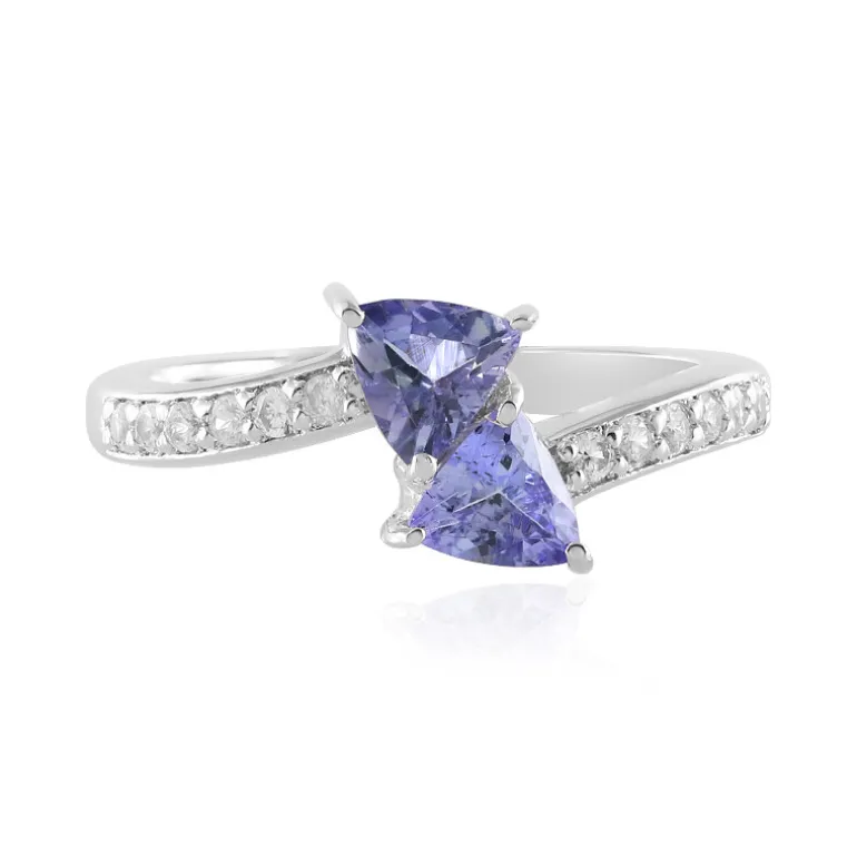 Dieser Ring aus Sterlingsilber ist mit glänzendem Platin überzogen und zeigt ein auffälliges Paar unerhitzter Tansanite im Trillant-Schliff aus Tansania mit einem Gesamtgewicht von 0,794 Karat, die in einem einzigartigen Design gefasst sind, das das Auge fesselt. 12 Zirkone im Rundschliff aus Kambodscha umrahmen das Band und verleihen ihm ein subtiles Funkeln. Mit einem Gewicht von ca. 2,78 Gramm verkörpert dieses exquisite Schmuckstück eine moderne Eleganz, die sich für das tägliche Tragen oder besondere Anlässe eignet. Es passt perfekt zur Berufskleidung oder zum Abendkleid und verspricht, eine vielseitige Ergänzung für jede Schmucksammlung zu sein.
