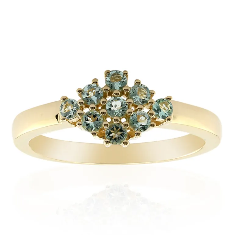 Dieser raffinierte und einzigartige nigerianische mintgrüne Beryllring funkelt mit neun Edelsteinen im Rundschliff von insgesamt 0,23 Karat. Die zarte Fassung aus 9 Karat Gelbgold mit einem Gewicht von ca. 2,04 Gramm bildet einen warmen Kontrast zu den kühlen Farbtönen der Berylle und sorgt für eine harmonische Farbmischung. Er ist ideal, um Ihrer Geschäftskleidung einen Hauch von Eleganz oder Ihrem Freizeitlook einen subtilen Glamour zu verleihen. Dieser Ring ist ein vielseitiges Accessoire, das sich für verschiedene Anlässe eignet, vom täglichen Tragen bis hin zu besonderen Anlässen.