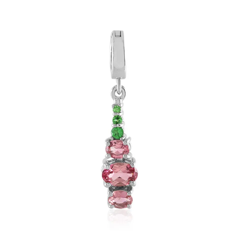 Dieser exquisite Anhänger verkörpert die Essenz von Luxus mit seinen leuchtenden nigerianischen rosa Turmalinen und funkelnden Tsavoriten aus Tansania, die zusammen ein Gesamtkaratgewicht von 0,731 ergeben. Die ovalen und runden Edelsteine sind aus glänzendem platiniertem 925er Sterlingsilber gefertigt und in einem anmutigen Tropfen-Design angeordnet. Dieser Anhänger ist ebenso vielseitig wie schön und eignet sich ideal, um einem Abendoutfit einen Hauch von Farbe zu verleihen oder einem Tagesensemble eine raffinierte Note zu verleihen.