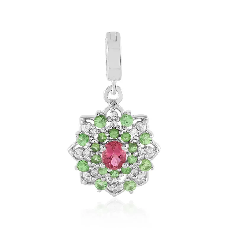 Entdecken Sie die faszinierende Mischung aus leuchtenden Farben mit diesem exquisiten Anhänger, dessen Herzstück ein nigerianischer rosa Turmalin im Ovalschliff von 0,312 Karat ist. Eingerahmt von glitzernden Tsavoriten mit einem Gesamtgewicht von 0,601 ct und ergänzt durch kambodschanische Zirkon-Akzente, wiegt dieses Stück aus 925er Sterlingsilber, das für zusätzlichen Glanz plattiert wurde, ca. 2,23 g. Sein floral inspiriertes Design macht ihn zu einem perfekten Accessoire für die Frühlingsgarderobe oder um neutralen Outfits einen Farbakzent zu verleihen. Der Anhänger ist mit einem praktischen Varioclip ausgestattet, der ein vielseitiges Tragen ermöglicht und eignet sich sowohl für einen legeren Brunch als auch für eine elegante Abendveranstaltung.