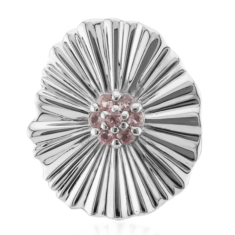 Entdecken Sie den subtilen Charme dieses bezaubernden Silberanhängers mit einem Cluster aus sieben rosafarbenen Turmalinen im Rundschliff aus Nigeria mit einem Gesamtkaratgewicht von 0,2ct. Jeder Edelstein ist sorgfältig in der Mitte einer wunderschön gearbeiteten Muschel aus platiniertem 925er Sterlingsilber gefasst, die Eleganz und Stil ausstrahlt. Mit einer Größe von 21 x 18 mm und einem Gewicht von ca. 3,06 g ist dieser Anhänger ein Zeugnis feiner Handwerkskunst und modernen Designs. Er ist eine ausgezeichnete Wahl, um Ihrem Alltagsoutfit einen Hauch von Farbe zu verleihen oder als anmutiger Begleiter für die Abendgarderobe.