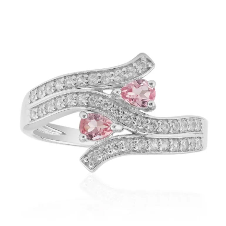 Entdecken Sie die Faszination dieses Silberrings mit rosa Turmalin und einem Gesamtgewicht von 0,765ct. Zwei nigerianische rosafarbene Turmaline im Birnenschliff werden von 39 kambodschanischen Zirkonen kunstvoll ergänzt und sorgen für einen funkelnden Effekt. Der Ring ist aus platiniertem 925er Sterlingsilber gefertigt und besticht durch seine moderne Eleganz. Perfekt, um der Abendgarderobe einen Hauch von Raffinesse zu verleihen oder den Alltags-Chic zu unterstreichen.