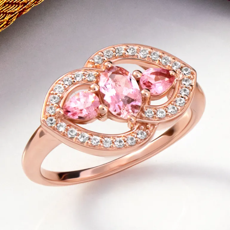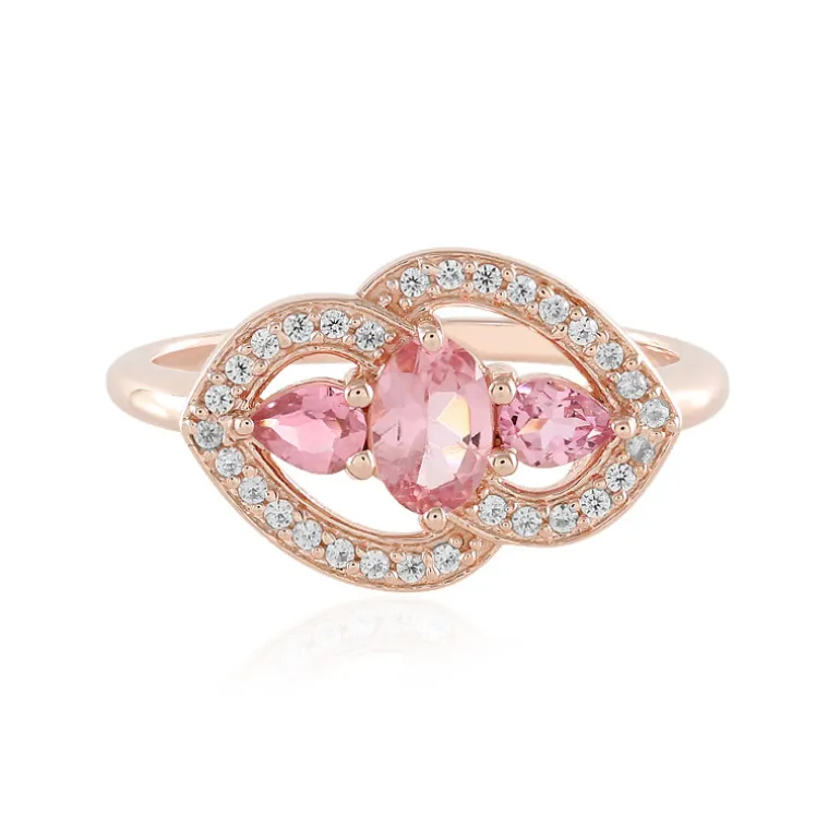 Dieser Ring aus rosévergoldetem 925er Sterlingsilber mit einem Trio nigerianischer rosafarbener Turmaline von insgesamt 0,616 ct. ist ein romantischer Blickfang. Der zentrale ovale Edelstein wird von zwei zarten birnenförmigen Turmalinen flankiert, die jeweils von einem Kranz schimmernder kambodschanischer Zirkon-Akzente umgeben sind. Dieses exquisite Schmuckstück verbindet moderne Eleganz mit klassischem Design und ist damit eine vielseitige Ergänzung für legere und formelle Ensembles. Feiern Sie Meilensteine oder werten Sie einfach Ihren täglichen Stil mit diesem charmanten, femininen Accessoire auf.