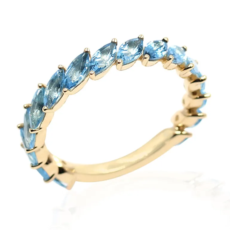 Dieser bezaubernde Ring aus 9 Karat Gelbgold ist mit einer Kaskade von 16 nigerianischen Aquamarinen im Marquiseschliff verziert, von denen jeder in einem ruhigen blauen Farbton schimmert, der an tropische Gewässer erinnert. Das Gesamtgewicht von 1,76 Karat verleiht Ihrer Hand eine luxuriöse Präsenz. Sorgfältig gefasst, um ihre individuelle Brillanz zu maximieren, bilden diese Edelsteine ein bezauberndes Band. Dieser Ring ist ideal, um sowohl bei Tag als auch bei Nacht einen Farbtupfer zu setzen und sorgt bei jeder Veranstaltung für Gesprächsstoff.