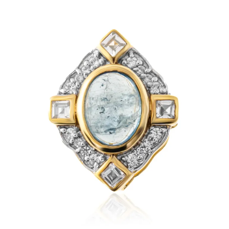 Entdecken Sie die fesselnde Anziehungskraft dieses vergoldeten Anhängers aus 925er Sterlingsilber, der einen 1,251 Karat schweren nigerianischen Ofiki-Aquamarin zur Schau stellt. Sein ovaler Cabochon-Schliff wird von funkelnden Zirkonen aus Tansania flankiert, die insgesamt 0,27ct ausmachen. Mit seiner vielseitigen Größe von 18×14 mm ist er perfekt geeignet, um sowohl Tages- als auch Abendgarderobe einen eleganten Touch zu verleihen. Der anmutige Kontrast aus ruhigem Blau und goldenem Farbton macht ihn zu einer umwerfenden Wahl für verschiedene Anlässe.