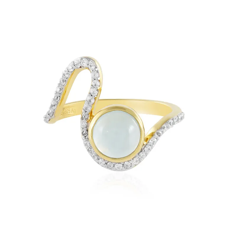Entdecken Sie die ruhige Schönheit dieses eleganten Rings mit einem 1,346 Karat schweren Ofiki-Aquamarin-Cabochon aus den reichen Landschaften von Nigeria. Umgeben von einem Orbit aus funkelnden Zirkonen von insgesamt 0,333ct aus Tansania, ist dieses exquisite Stück aus 925er Sterlingsilber mit einer luxuriösen Goldplattierung gefertigt und wiegt ca. 2,61g. Das zeitgenössische Design mit den Maßen 23×20 mm bringt den ruhigen blauen Farbton des Aquamarins perfekt zur Geltung und macht ihn zu einem idealen Accessoire, das sowohl tagsüber für Raffinesse als auch abends für Glamour sorgt. Machen Sie diesen Ring zu einem Highlight in Ihrer Sammlung oder zum perfekten Geschenk für einen besonderen Menschen.