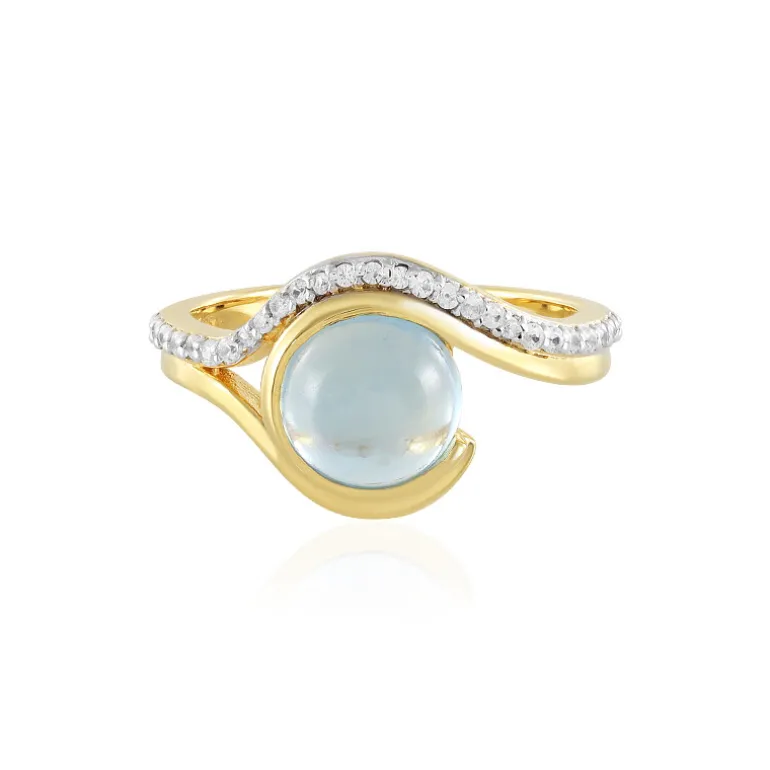 Entdecken Sie die Anziehungskraft dieses bezaubernden Rings mit einem 1,77 Karat großen runden Cabochon eines nigerianischen Ofiki-Aquamarins, der in einer goldenen Umarmung eingebettet ist. Das Band aus 925er Sterlingsilber ist vergoldet und wird von einer funkelnden Reihe tansanischer Zirkon-Akzente von insgesamt 0,196 Karat geschmückt, die bei jeder Bewegung einen eleganten Schimmer verströmen. Dieses Schmuckstück eignet sich perfekt, um sowohl tagsüber als auch abends einen Hauch von Raffinesse zu verströmen und ist eine vielseitige Ergänzung für jede Schmucksammlung.