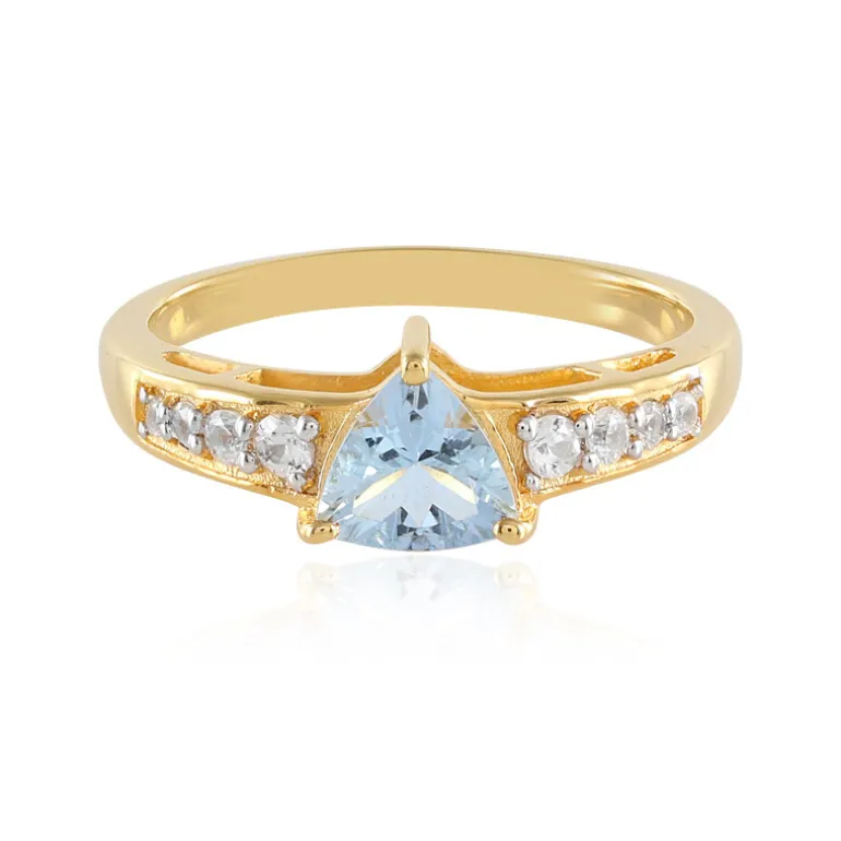 Schmücken Sie Ihre Hand mit der subtilen Eleganz dieses Rings aus vergoldetem 925er Sterlingsilber. Ein atemberaubender nigerianischer Aquamarin im Trillant-Schliff von 0,5 Karat steht im Mittelpunkt und wird von einem funkelnden Halo aus Zirkonen im Präzisionsschliff von insgesamt 0,205 Karat aus Tansania ergänzt. Die zarten Aquatöne und das sanfte Gold versprechen Vielseitigkeit, sowohl für den Tag als auch für den Abend. Dieser Ring ist ideal, um jedem Ensemble einen Hauch von Raffinesse zu verleihen und erweist sich als zeitlose Ergänzung Ihrer Schmucksammlung.