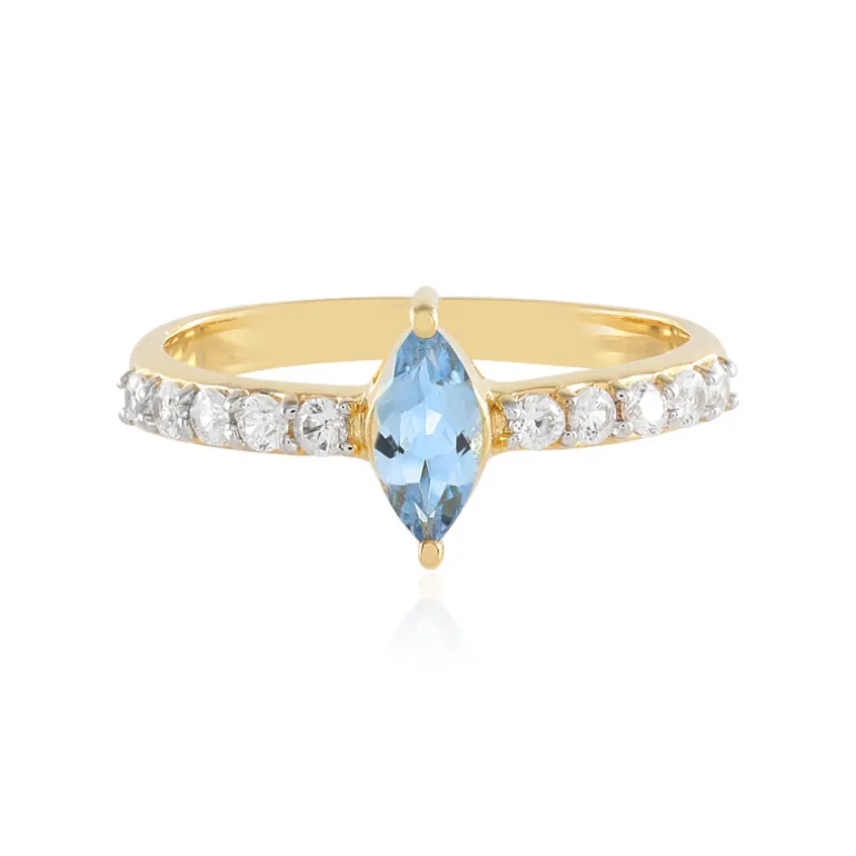 Dieser atemberaubende Ring zeigt in der Mitte einen nigerianischen Aquamarin im einzigartigen Marquise-Schliff, der von runden Zirkonen aus Tansania umgeben ist und ein bezauberndes Funkeln erzeugt. Der Kontrast zwischen dem Aquamarin im Marquise-Schliff und den umliegenden Zirkonen, gefasst in 925er Sterlingsilber mit einer luxuriösen Goldauflage, macht diesen Ring zu einem vielseitigen Schmuckstück, das sich für den Alltag oder besondere Anlässe eignet. Das Gesamtkaratgewicht von 0,839 ct. sorgt für ein wunderbar ausgewogenes Aussehen. Kombinieren Sie dieses auffällige Schmuckstück sowohl mit lässigen, schicken Outfits als auch mit einem formellen Ensemble, um Ihren Stil zu unterstreichen.