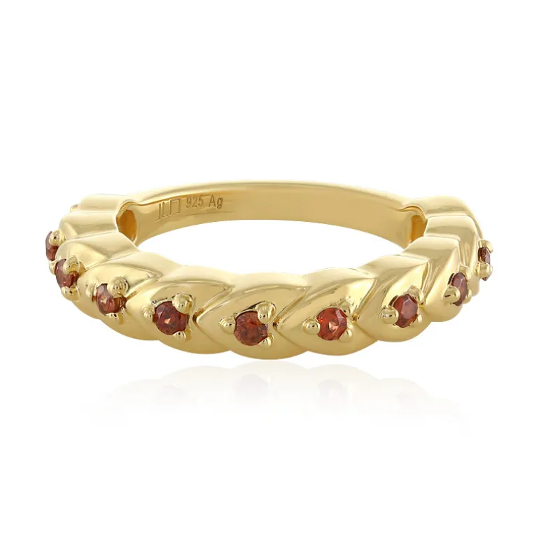 Lassen Sie sich von der Wärme und dem Charme dieses Rings aus vergoldetem 925er Sterlingsilber verzaubern, der eine Kaskade von leuchtenden orangefarbenen Zirkonen aus Kambodscha mit insgesamt 0,318 Karat präsentiert. Jeder Edelstein ist präzise in eine runde Form geschliffen, um seinen feurigen Farbton zu betonen, und in ein elegantes vergoldetes Band eingefasst, was ihn zu einem verführerischen Accessoire sowohl für den Alltag als auch für besondere Anlässe macht. Dieser Ring ist ein vielseitiges Schmuckstück, das die Schönheit des Zirkons unterstreicht und ideal ist, um Ihrem Ensemble einen Farbakzent zu verleihen.