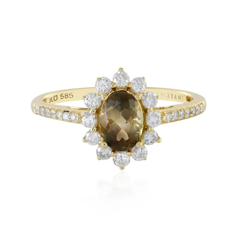 Dieser Ring ist eine luxuriöse Komposition aus einem glänzenden Oregon-Sonnenstein von 0,68 Karat, der von einem strahlenden Halo aus glitzernden Diamanten gehalten wird. Der zentrale Sonnenstein stammt aus den USA und hat einen fesselnden ovalen Schliff. Das 14-karätige Goldband umschließt den Edelstein perfekt und wird von 26 SI1 (H) Diamanten von insgesamt 0,44 Karat veredelt, die ihn glänzend umspielen. Mit einem Gewicht von ca. 2,01 g sorgt dieser Ring für Gesprächsstoff und ist ideal für besondere Anlässe, bei denen Sie Ihren Stil zur Geltung bringen möchten.