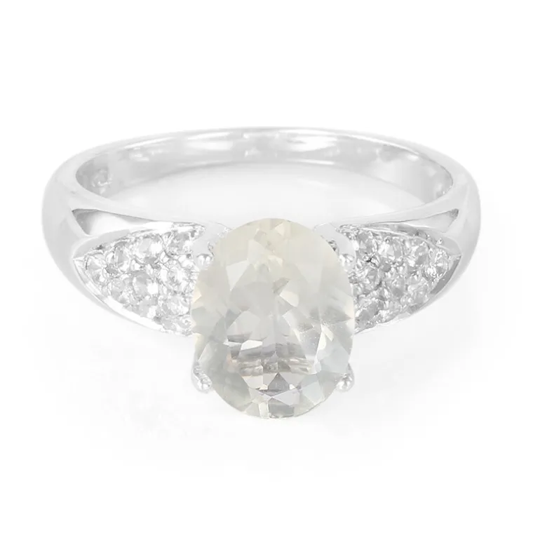 Entdecken Sie die Anziehungskraft dieses Rings aus Sterlingsilber mit einem fesselnden Madagaskar-Orthoklas im Ovalschliff von 1,27 Karat, ergänzt durch eine Reihe funkelnder weißer Topase von insgesamt 0,28 Karat. Gefertigt aus 925er Sterlingsilber, wird die Brillanz dieses Rings durch die Präzision des runden Brillantschliffs jedes brasilianischen Topas verstärkt. Mit seinem anmutigen Design, das Raffinesse ausstrahlt, eignet sich dieses Schmuckstück sowohl für legere als auch für formelle Anlässe und ist somit eine vielseitige Ergänzung für jede Schmucksammlung.