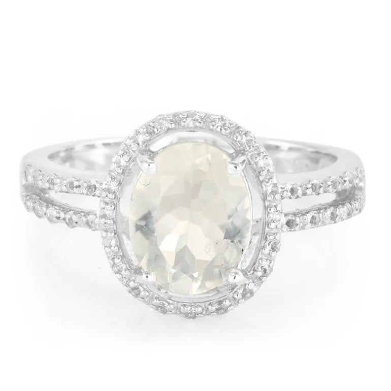 Entdecken Sie die subtile Eleganz dieses Rings aus Sterlingsilber mit einem 1,44-karätigen Orthoklas im Ovalschliff aus Madagaskar, der von funkelnden weißen Topas-Akzenten umrahmt wird. Der aus 925er Sterlingsilber gefertigte Ring verbindet klassisches Design mit moderner Handwerkskunst. Kombinieren Sie ihn mit Ihrer Berufsgarderobe für einen dezenten Look oder verleihen Sie Ihrer Abendgarderobe für einen Hauch von Raffinesse den letzten Schliff.