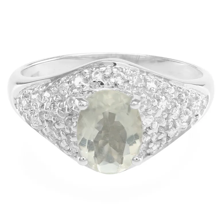 Entdecken Sie die subtile Eleganz dieses Rings aus Sterlingsilber mit einem bezaubernden Orthoklas im Ovalschliff von 0,99 Karat von der üppigen Insel Madagaskar. Umgeben von einem funkelnden Halo aus 34 runden weißen Topasen im Brillantschliff mit einem Gesamtgewicht von 0,293 ct. hat dieses Schmuckstück ein Gesamtgewicht von 1,283 ct. Mit seiner ruhigen Farbpalette und seinem zeitlosen Design ist er ein ideales Accessoire für den Alltag und für besondere Anlässe. Das 925er Sterlingsilber umschließt die Edelsteine sanft und bietet eine haltbare und glänzende Fassung.