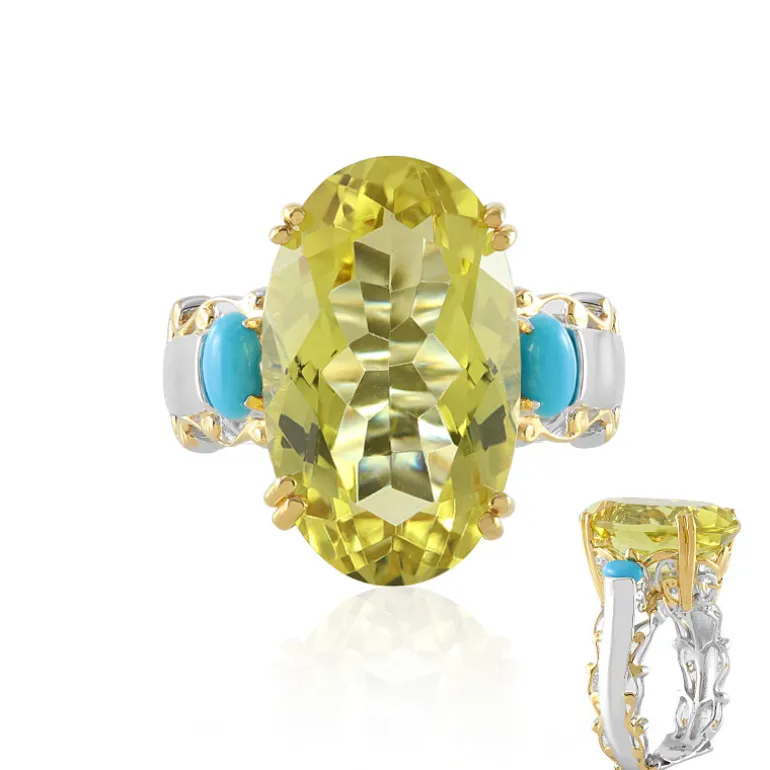 Entdecken Sie die strahlende Schönheit dieses Rings von Gems en Vogue, der einen brasilianischen Ouro-Verde-Quarz von 10,422 Karat mit einem atemberaubenden ovalen Schliff zeigt, der von zwei unberührten Dornröschen-Türkis-Cabochons von insgesamt 0,36 Karat flankiert wird. Das aus poliertem 925er Sterlingsilber gefertigte Schmuckstück verbindet den leuchtenden Zitronenton mit ruhigen, himmelblauen Akzenten, die einen unwiderstehlichen Reiz ausüben. Es ist die ideale Wahl sowohl für besondere Anlässe als auch für den eleganten Alltag und lässt sich sowohl mit Pastellfarben als auch mit kräftigen Farben hervorragend kombinieren.