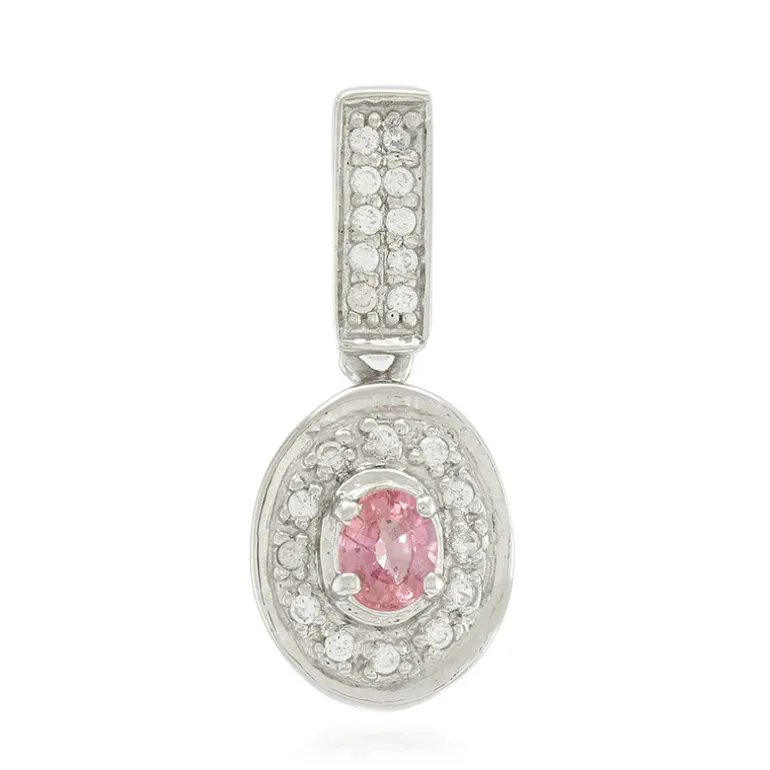 Dieser exquisite Anhänger zeigt einen atemberaubenden Padparadscha-Saphir aus Sri Lanka, der elegant von 22 Zirkonen im Brillantschliff umgeben ist. In platiniertem Sterlingsilber gefasst, versprüht dieses zarte Stück einen raffinierten Charme. Mit einer Größe von 25×10 mm ist er sowohl für den Alltag als auch für besondere Anlässe geeignet. Kombinieren Sie ihn mit einer schlichten Silberkette für einen raffinierten Look oder mit einem kleinen Schwarzen für einen Abend.