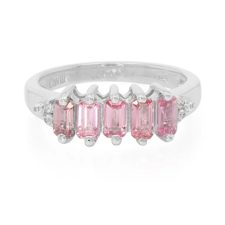 Erfreuen Sie sich an der einzigartigen Anziehungskraft dieses Padparadscha-Saphirrings aus Sri Lanka, der für seinen seltenen rosa-orangen Farbton geschätzt wird. Das Quintett aus 1,26 ct. achteckig geschliffenen Saphiren strahlt Wärme und Raffinesse aus, die sich harmonisch auf platiniertem 925er Sterlingsilber anordnen. Funkelnde kambodschanische Zirkon-Akzente von insgesamt 0,073 Karat verleihen dem Ring einen subtilen Schimmer. Dieses Schmuckstück mit einem Gewicht von ca. 2,89 g verbindet zeitlose Eleganz mit einem Hauch von modernem Flair und ist eine exquisite Wahl für besondere Anlässe oder als bezaubernde Ergänzung zu Ihrem täglichen Ensemble.