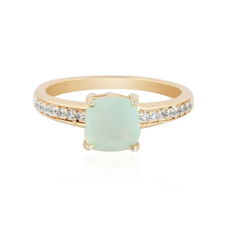 Tauchen Sie ein in die beruhigenden Farben des brasilianischen Paraiba-Opals, der das Herzstück dieses Rings aus vergoldetem 925er Sterlingsilber bildet. Um den antiken Edelstein im Kissenschliff herum fangen 14 kambodschanische Zirkone mit einem Gesamtgewicht von 0,094 ct. das Licht mit ihrem runden Schliff und ihrer Brillanz ein. Eine zarte Fassung von 1,7 g trägt den ruhigen, meergrünen Opal und macht dieses Schmuckstück zu einem idealen Accessoire für heitere Abende oder formelle Anlässe. Kombinieren Sie es mit pastellfarbenen oder cremefarbenen Outfits für einen Hauch von schlichter Eleganz.