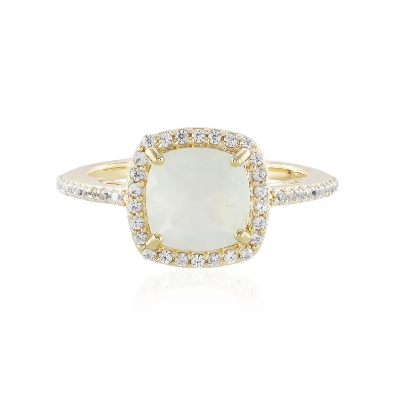 Entdecken Sie die ruhige Schönheit dieses brasilianischen Paraiba-Opalrings mit einem 1,33 Karat schweren Edelstein im antiken Kissenschliff, der von einem Halo aus funkelnden kambodschanischen Zirkonen von insgesamt 0,437 Karat ergänzt wird. Jeder Edelstein ist sorgfältig in 2,59 Gramm vergoldetes 925er Sterlingsilber gefasst, was die Opulenz dieses Schmuckstücks noch verstärkt. Stellen Sie sich vor, wie dieser exquisite Ring Ihre Cocktailgarderobe aufwertet oder einen Hauch von Raffinesse in Ihre Alltagsgarderobe bringt. Sein zeitloses Design macht ihn zu einem idealen Geschenk für einen besonderen Menschen oder zu einer wertvollen Ergänzung Ihrer eigenen Sammlung.
