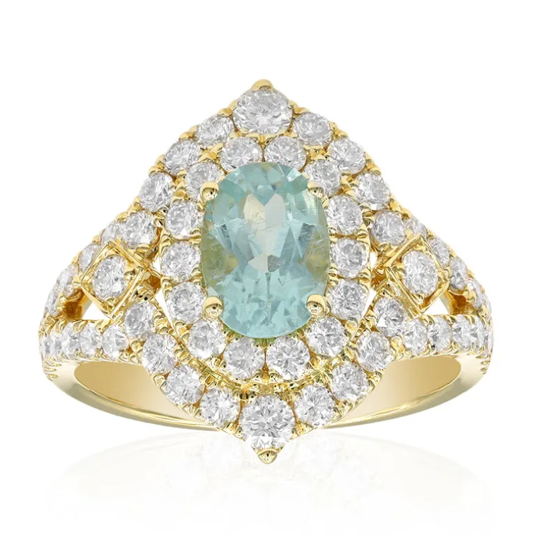 Entdecken Sie die Faszination dieses Paraiba-Turmalin-Goldrings, der mit einem 1,13-karätigen Mosambik-Turmalin und 62 schillernden SI2-Diamanten im Brillantschliff kunstvoll gefertigt wurde. Der Ring ist in 18 Karat Gelbgold gefasst und strahlt Luxus und Raffinesse aus. Er eignet sich perfekt für elegante Abende oder besondere Feierlichkeiten und verleiht jedem Outfit einen Hauch von Glamour. Setzen Sie mit diesem exquisiten Ring ein mutiges Statement in Ihrer Schmucksammlung.