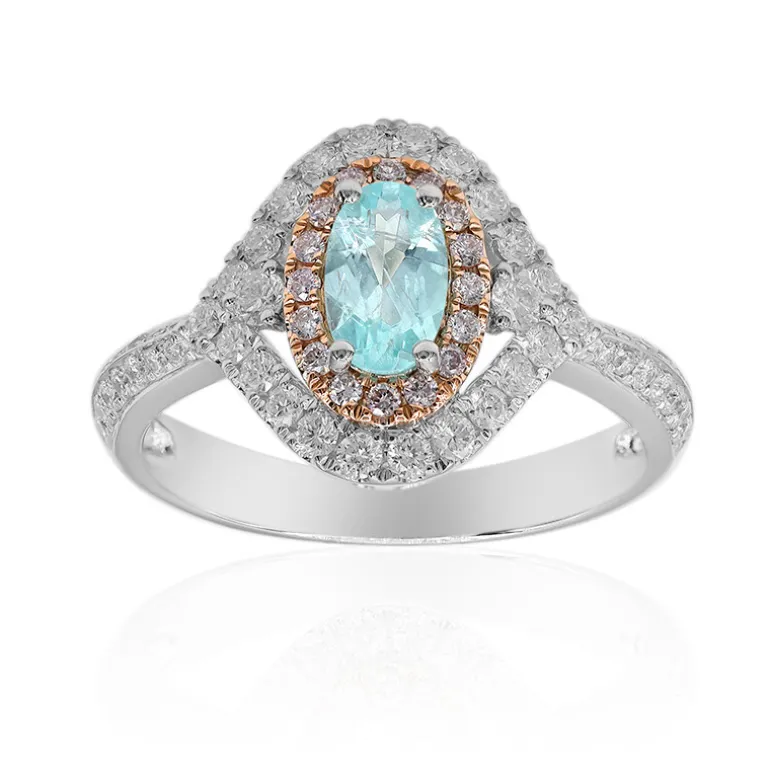 Lassen Sie sich von diesem Ring mit einem ovalen Paraiba-Turmalin von 0,53 Karat aus Mosambik verzaubern. Dieses atemberaubende Schmuckstück aus 750er Rosé- und Weißgold mit einem Gewicht von 3,89 g ist von funkelnden Diamanten in SI2 und Rosa umgeben. Als raffinierte Wahl für formelle Abende oder gehobene Veranstaltungen passt er wunderbar zu eleganter Kleidung und bietet eine faszinierende Mischung aus Farbe und Brillanz.