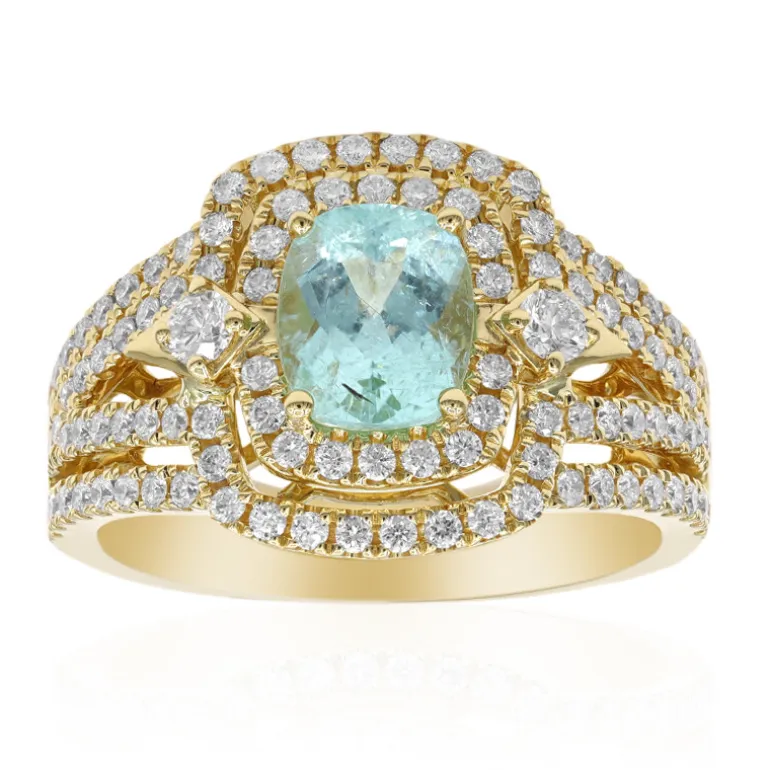 Erleben Sie die faszinierende Anziehungskraft dieses Paraiba-Turmalin-Goldrings mit einem atemberaubenden Edelstein im Antikschliff von 1,28 Karat aus Mosambik. Umgeben von 106 Diamanten im Brillantschliff mit einem Gesamtgewicht von 0,77 Karat, ist dieses luxuriöse Schmuckstück aus 750er Gelbgold gefertigt und wiegt ca. 6,85 g. Dieser Ring ist perfekt, um formellen Anlässen oder einem eleganten Abend einen Hauch von Eleganz zu verleihen. Er passt sowohl zu klassischer als auch zu moderner Kleidung.