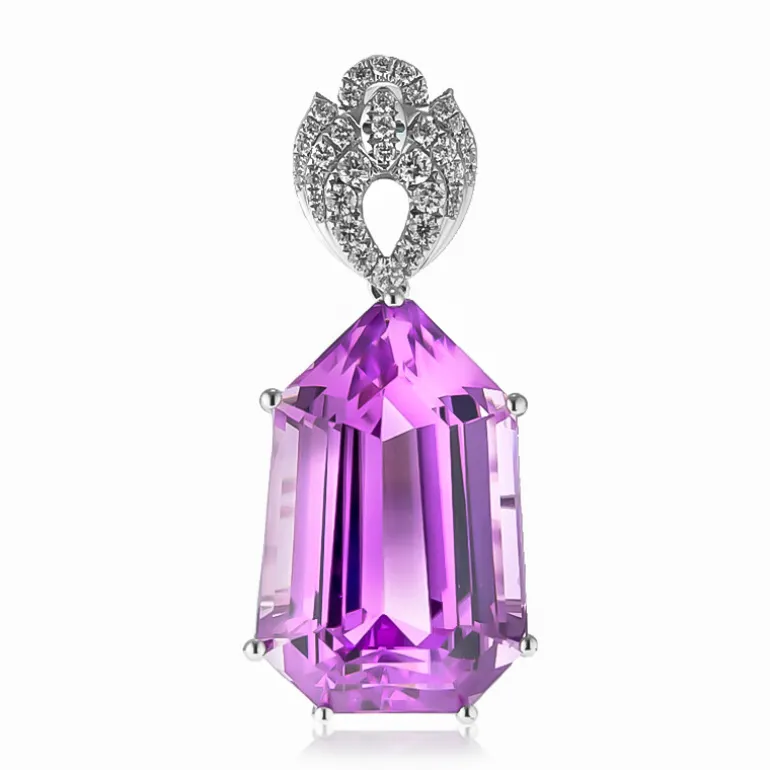 Entdecken Sie die Anziehungskraft dieses atemberaubenden Afghan Patroke Kunzit-Anhängers, der einen faszinierenden 39,15ct Kunzit im Fancy-Schliff in einem lebhaften violetten Farbton präsentiert. Ergänzt durch funkelnde SI2-Diamanten von insgesamt 0,47 Karat und in luxuriösem 18-karätigem Weißgold gefertigt, ist dieses AMAYANI-Stück ein Schatz für jede Sammlung. Sein exquisites Design unterstreicht die natürliche Schönheit des Steins und macht ihn zu einem Highlight für Galas und elegante Abende. Kombinieren Sie ihn mit einem eleganten Kleid und lassen Sie seine Eleganz erstrahlen.