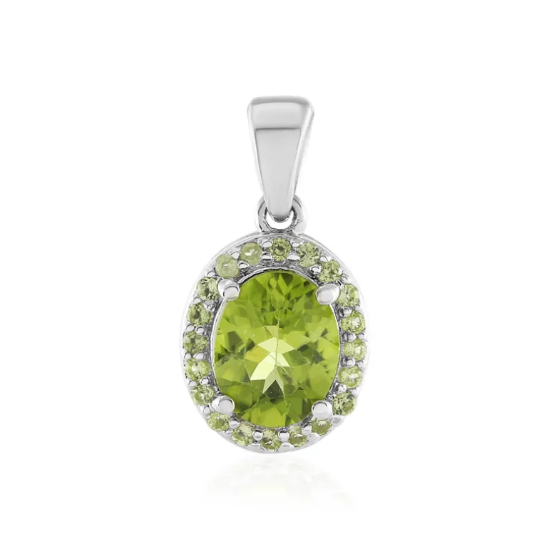 Entdecken Sie die Eleganz dieses exquisiten Peridot-Silberanhängers mit einem atemberaubenden Peridot von 2,22 Karat im Ovalschliff aus China, umgeben von 20 kleineren Peridots im Rundschliff. Er ist aus 925er Sterlingsilber gefertigt und platiniert, wiegt 2,31 g und misst 22 x 12 mm. Dieser Anhänger eignet sich perfekt für die Abendgarderobe oder um der Alltagskleidung einen Hauch von Eleganz zu verleihen und ist eine vielseitige Ergänzung für jede Schmucksammlung.