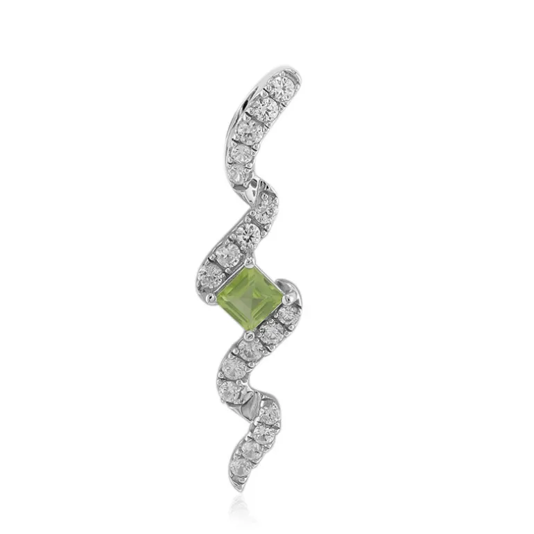 Entdecken Sie die Anziehungskraft dieses faszinierenden Anhängers mit einem leuchtenden chinesischen Peridot, der in einer quadratischen Form geschliffen wurde, um seinen Glanz zu verstärken. Eingebettet in eine Spirale aus schimmerndem Zirkon aus Kambodscha, hat dieses Stück ein Gesamtkaratgewicht von 0,486 ct und ist in platiniertem 925er Sterlingsilber gefasst. Das moderne, gedrehte Design verleiht ihm einen Hauch von Raffinesse, ideal als Accessoire für legere und formelle Kleidung. Eine wirklich einzigartige Ergänzung für jede Schmucksammlung.