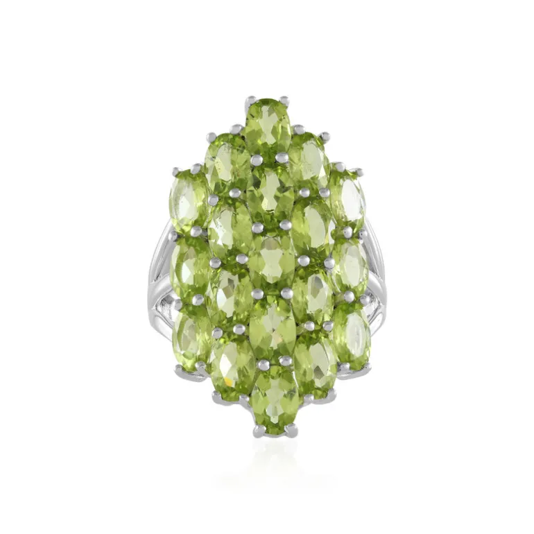 Dieser atemberaubende Ring präsentiert 19 leuchtende Peridots aus China mit insgesamt 6,66 Karat. Die oval geschliffenen Edelsteine sind in 925er Sterlingsilber gefasst und ziehen die Blicke auf sich. Dieses gewagte Schmuckstück eignet sich sowohl für zwanglose Ausflüge als auch für formelle Anlässe und lässt sich wunderbar mit Sommerkleidern oder Abendroben kombinieren. Sein frischer und lebendiger Grünton verleiht jedem Ensemble einen Hauch von Farbe.