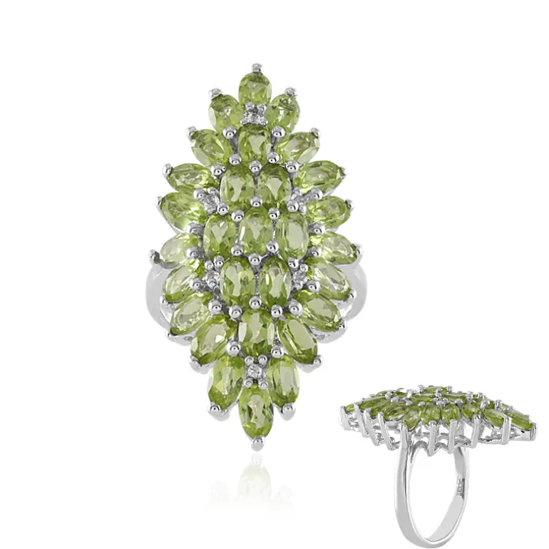 Dieser bezaubernde Ring mit 29 funkelnden Peridots im Ovalschliff aus China mit insgesamt 5,706 Karat ist eine wahre Symphonie aus Grün. Akzentuiert mit 6 weißen Topasen aus Indien, zeigt dieses Meisterwerk aus 925er Sterlingsilber einen üppigen waldähnlichen Farbton. Das 5,96 g schwere Band trägt die Edelsteine anmutig und bietet ein atemberaubendes Prunkstück. Dieser Ring ist ideal für alle, die ihrer Sammlung einen Hauch von naturinspirierter Raffinesse verleihen möchten. Er ist ein Gesprächsanlass bei jeder gesellschaftlichen Zusammenkunft oder ein geschätztes Stück für die tägliche Eleganz.