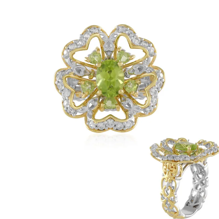Bewundern Sie die atemberaubende Handwerkskunst unserer Peridot Sterling Silber Floral Ring. Dieser Ring ist mit einem fesselnden ovalen Peridot von 1,197 Karat und mehreren herzförmigen Peridots besetzt und mit schillernden Zirkonen akzentuiert. Das komplizierte florale Design macht ihn zu einem perfekten Statement-Stück. Er eignet sich sowohl für elegante Anlässe als auch für den Alltag. Kombinieren Sie ihn mit Ihrem Lieblingsabendkleid, um wirklich zu glänzen.